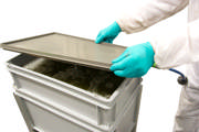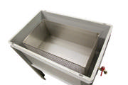 - Filtering: Open the tab in the centre of the container, product will drain into the 2nd container. Use a spatula to move all the product thru the drain and remove the top container.