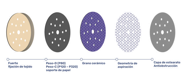 Portador de papel, diseñado para crear un patrón de rayado variado para un rendimiento de corte óptimo, permitiendo un lijado agresivo y una rápida eliminación del material.