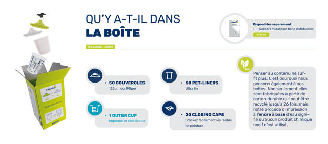 Notre nouveau système Finixa Paint est certainement innovant à cet égard. Le système renouvelé utilise un revêtement PET ultra-fin. L’utilisation de polyéthylène téréphtalate (PET) nous donne une longueur d’avance en matière d’écologie. En effet, nous utilisons 40 à 50 % de plastique en moins pour produire nos nouveaux gobelets intérieurs flexibles, par rapport à la moyenne de revêtement de nos concurrents sur le marché. Si l’on considère que le marché européen compte 150 millions de systèmes produits, cela représente une quantité considérable de plastique que nous pouvons éviter d’utiliser.