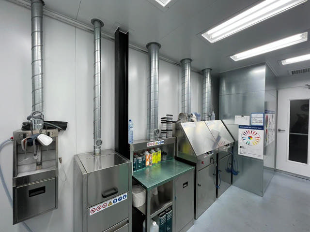 Na montagem da sala de mistura, foram utilizados vários produtos da Hamach. Para criar o posto de trabalho, foi utilizada uma mesa de dosagem RVS da Hamach, com depósito de resíduos incorporado. Ao lado, encontra-se ainda um centro de resíduos feito à medida para resíduos de tinta. Trata-se de um contentor de resíduos resistente a fluidos, destinado a resíduos de tinta e agentes de diluição, onde é possível colocar recipientes com restos de tinta e diluente, ao contrário, fechando depois o contentor. Em seguida, os fluidos escoam para 2 recipientes situados por baixo, sendo que todos os vapores prejudiciais são removidos através da conduta de extração. As HR 2400, HR 2000 e HR 1400 foram as opções escolhidas para a limpeza das pistolas de pulverização.